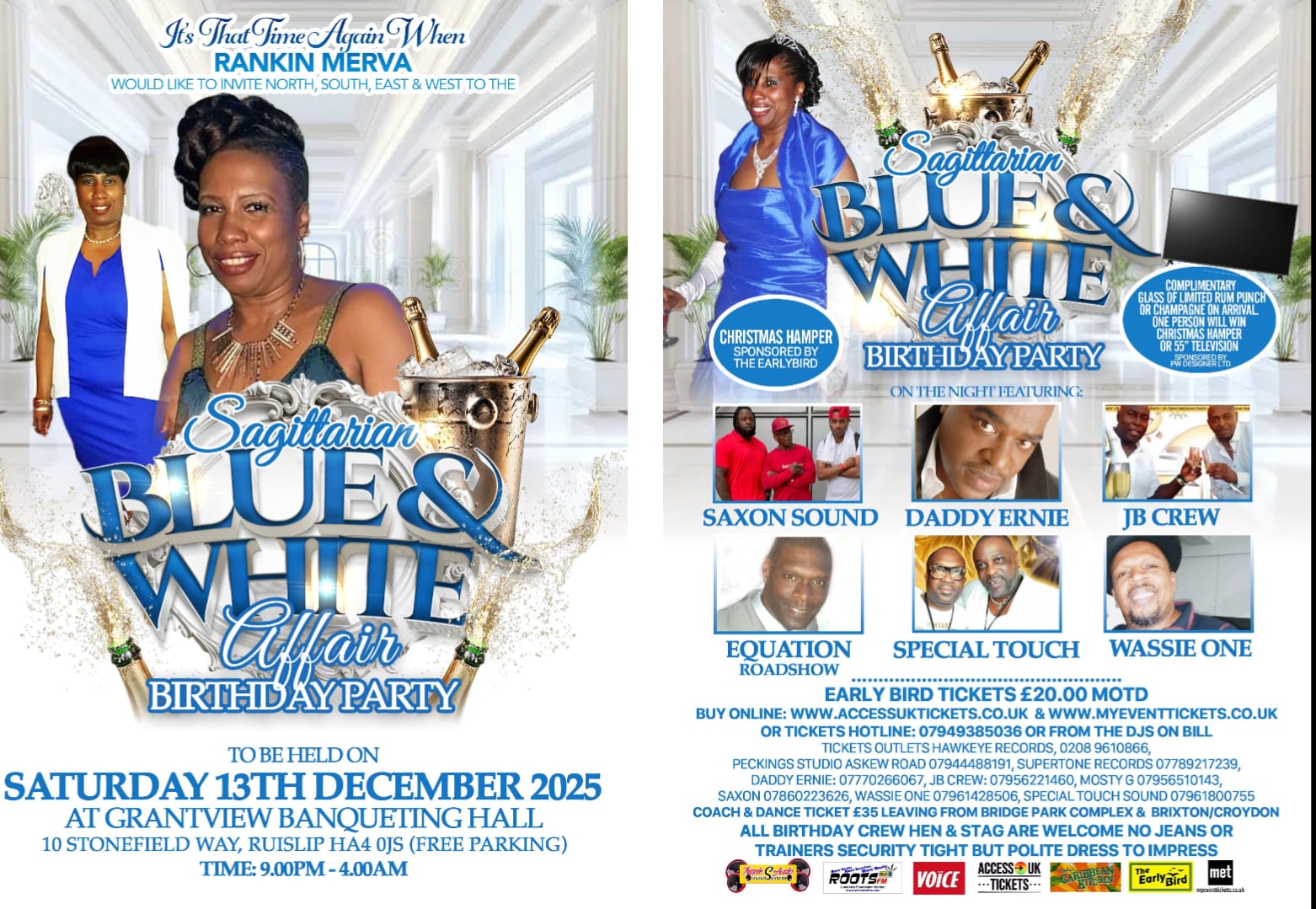 RANKIN MERVA INVITE NORTH, SOUTH, EAST & WEST TO THE Sagittarian BLUE & WHITE Affair BIRTHDAY PARTY SATURDAY 13TH DECEMBER 2025 AT GRANTVIEW BANQUETING HALL 10 STONEFIELD WAY, RUISLIP HA4 0JS (FREE PARKING) – TIME: 9.00PM-4.00AM UK TIME